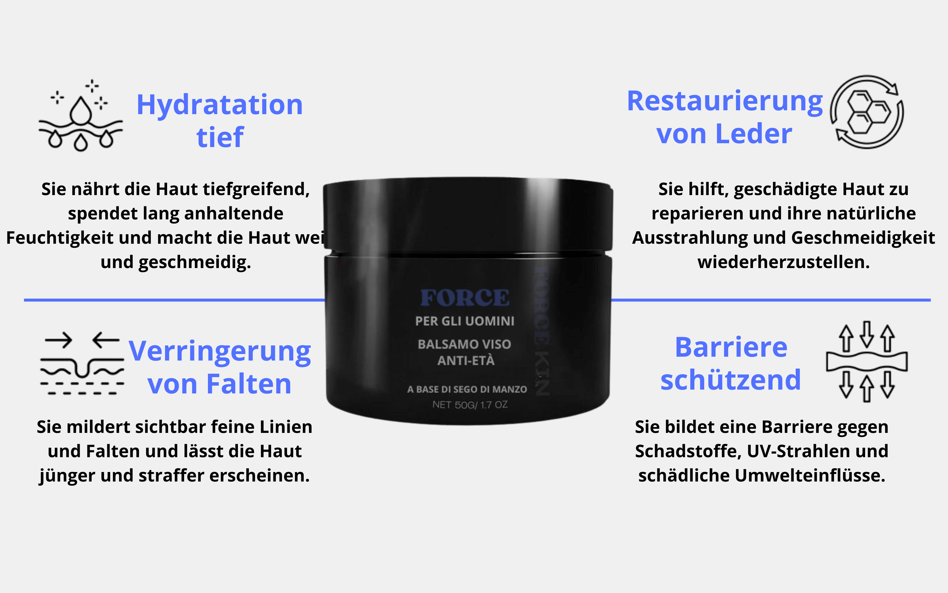 ForceSkin Anti-Ageing Balm ist eine feuchtigkeitsspendende Creme, die speziell für Männer entwickelt wurde. Seine mit Rindertalg angereicherte Formel hilft, die sichtbaren Zeichen der Hautalterung zu reduzieren, nährt und revitalisiert die Haut und verleiht ihr ein jugendlicheres und strahlenderes Aussehen.